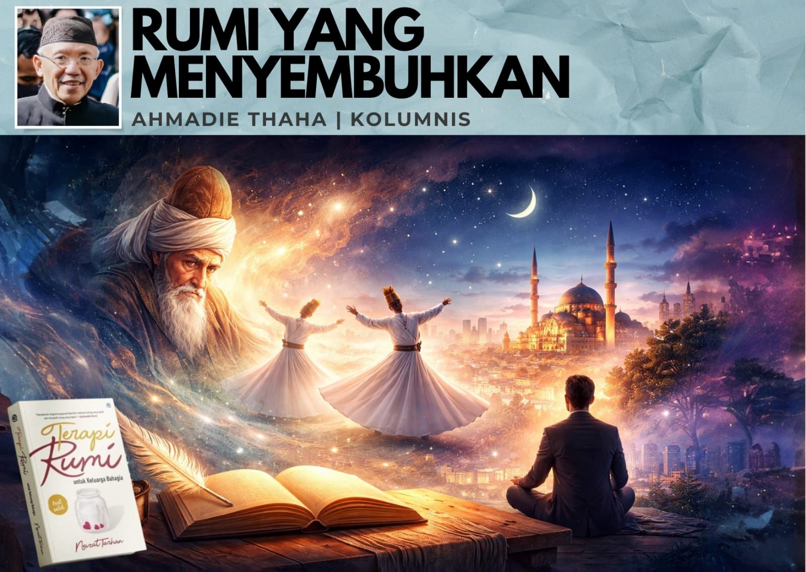 Tapi buku karyanya ini bukan panduan terapi klinis seperti yang dibayangkan orang. Tak ada resep obat, tak ada teknik relaksasi instan, melainkan pembacaan reflektif atas puisi-puisi Jalaluddin Rumi untuk memahami luka batin manusia modern.